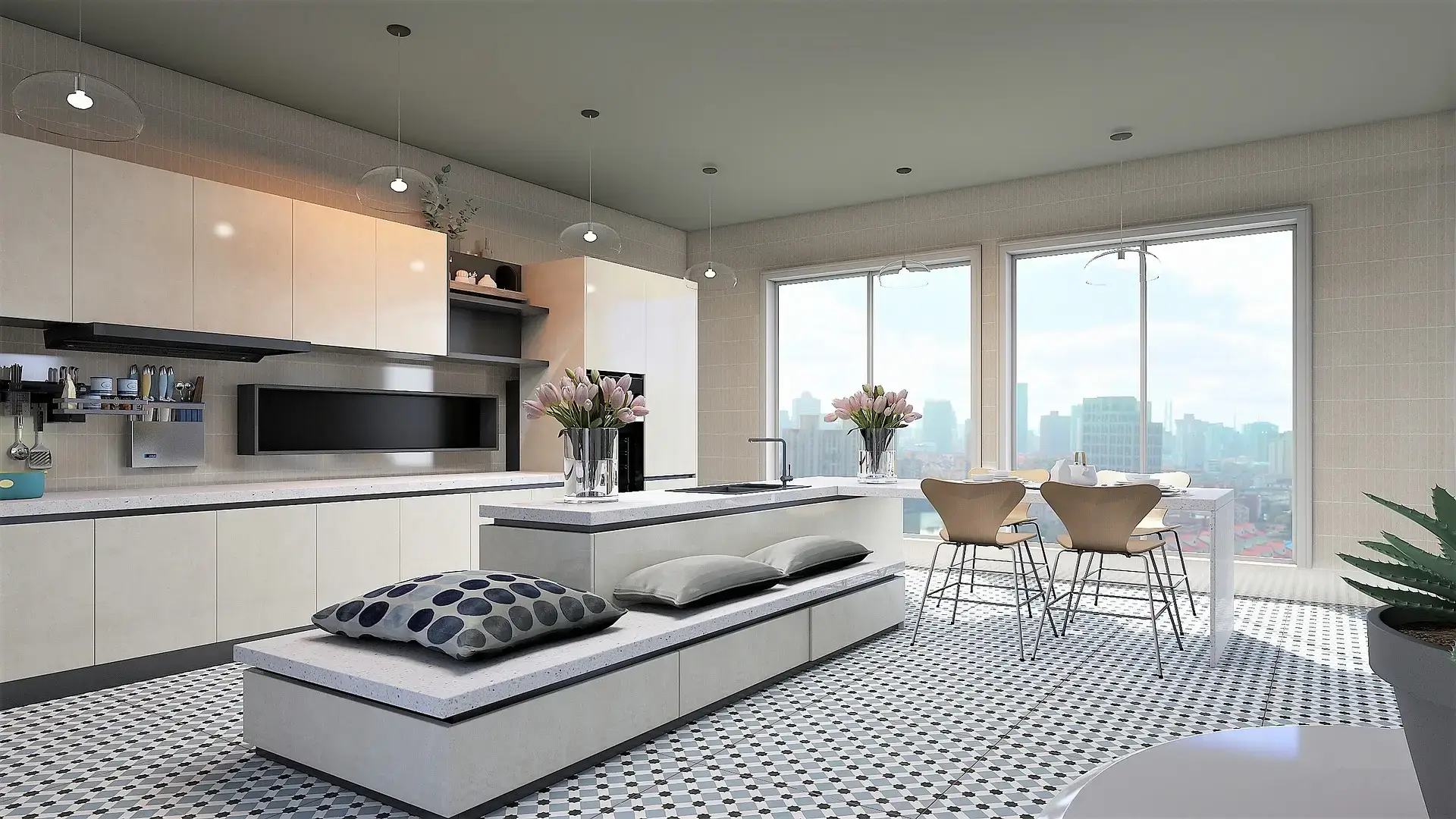 Завдяки продуманому зонуванню, вдалося розмістити усе необхідне для життєдіяльності замовників. У квартирі є передпокій з величезною шафою та місцем для сидіння, основна кімната з повноцінною кухнею з барною стійкою для сніданків або швидких перекусів; на достатній відстані розташована зона столової зі столом та стільцями, трохи далі знаходиться робоче місце та зона вітальні. Минаючи кухню потрапляємо у спальню, де організовано повноцінне місце для відпочинку та окрема гардеробна кімната. Завдяки тому, що холодильник сховали у шафу, кухня вийшла простора, функціональна та з мінімальною кількістю верхніх шафок. Місця для зберігання посуду та іншого начиння виготовили з МДФ, з двостороннім фарбуванням.